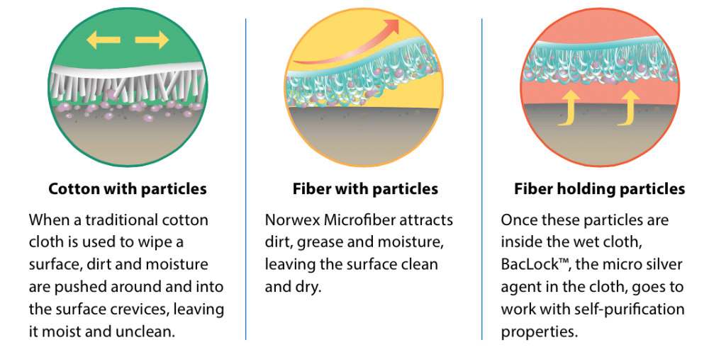 Norwex microfiber cleans mechanically by removing up to 99% of bacteria on surfaces when properly cared for.